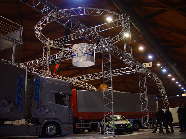Circle diameters varying from 5 to 40m or more are no exception. Since we always use 'straight' truss items (no curved trussings) to create a desired circle or shape, the benefit of minimising transport space is huge !